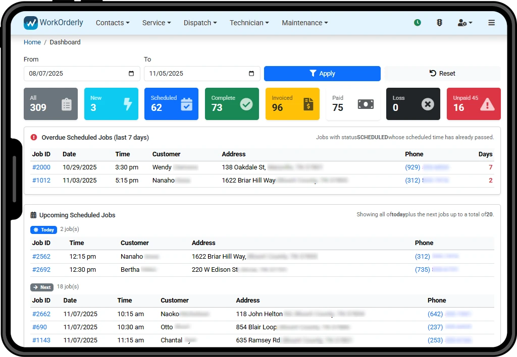 Stop sifting through paper, spreadsheets, and scattered data. Our intuitive Dashboard provides a real-time snapshot of your entire service operation. See pending service requests, track the status of ongoing jobs, monitor unpaid invoices, and gain valuable insights into your team’s performance – all from one central, easy-to-understand app.