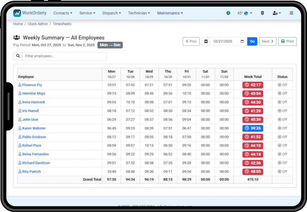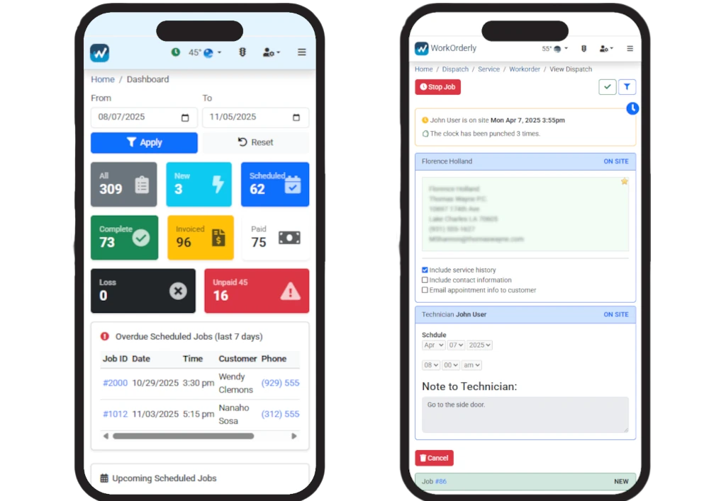 The work order screen provides a complete and actionable overview of each service request. At a glance, access crucial contact information, including customer details and location, ensuring you have everything you need before dispatch. Track the job’s progress through clear status job status indicators and payment statuses. This centralized view eliminates the need to navigate through multiple sections, putting all essential job-related data right at your fingertips for efficient management.